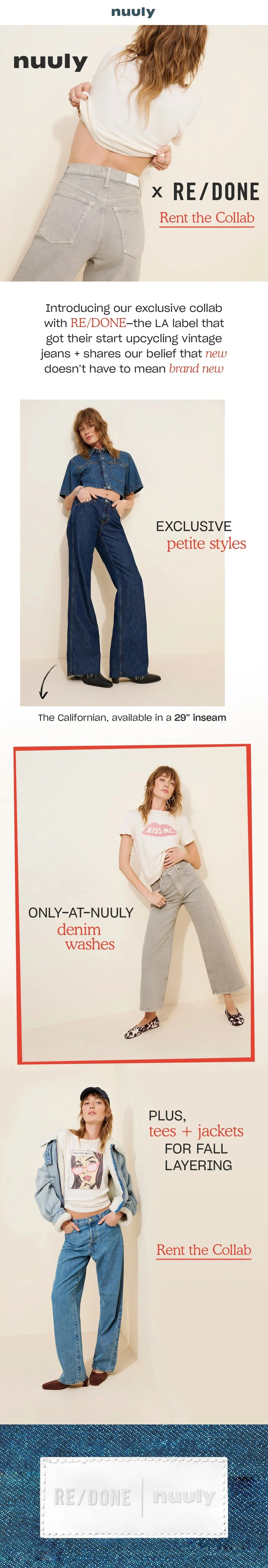 Nuuly partnered with RE/DONE to spotlight the brand’s modern take on heritage denim within the rental space. The creative direction translated RE/DONE’s vintage-inspired aesthetic into Nuuly’s digital ecosystem, delivering a cohesive cross-channel rollout across email and social.