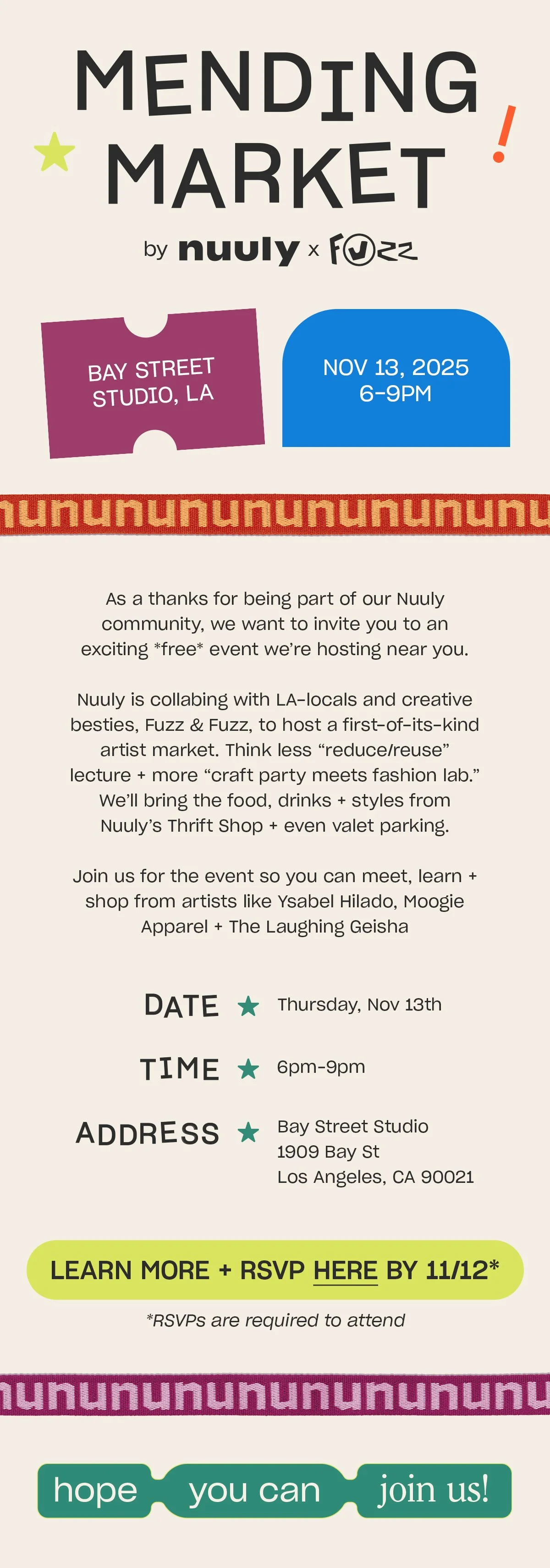 Nuuly hosted Mending Market, an in-person event designed to position the brand as a creative leader in circular fashion. The visual identity and cross-channel rollout extended the experience beyond the physical space, reinforcing Nuuly’s commitment to modern, accessible clothing longevity through both IRL and digital storytelling.